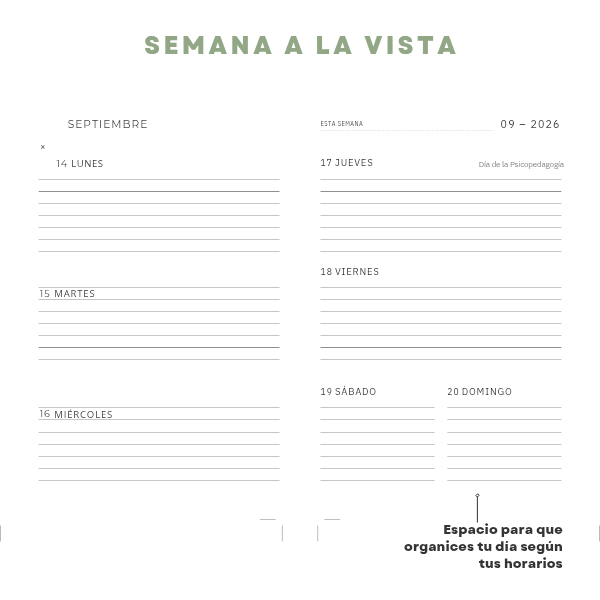 - Agenda semana a la vista con horario. Incluye calendario del mes en curso y espacio para anotaciones
